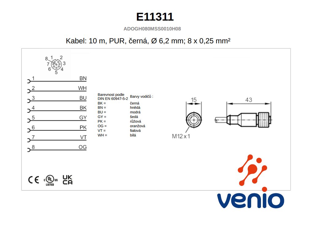 E11311 kábel 10m s priamym konektorom M12, 8-pin, samica, 8x0,25mm