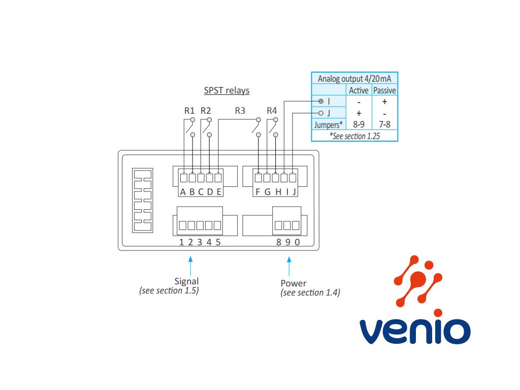 - Obsahuje 4 relé SPST a 1 analógový výstup 4/20 mA izolovaný.