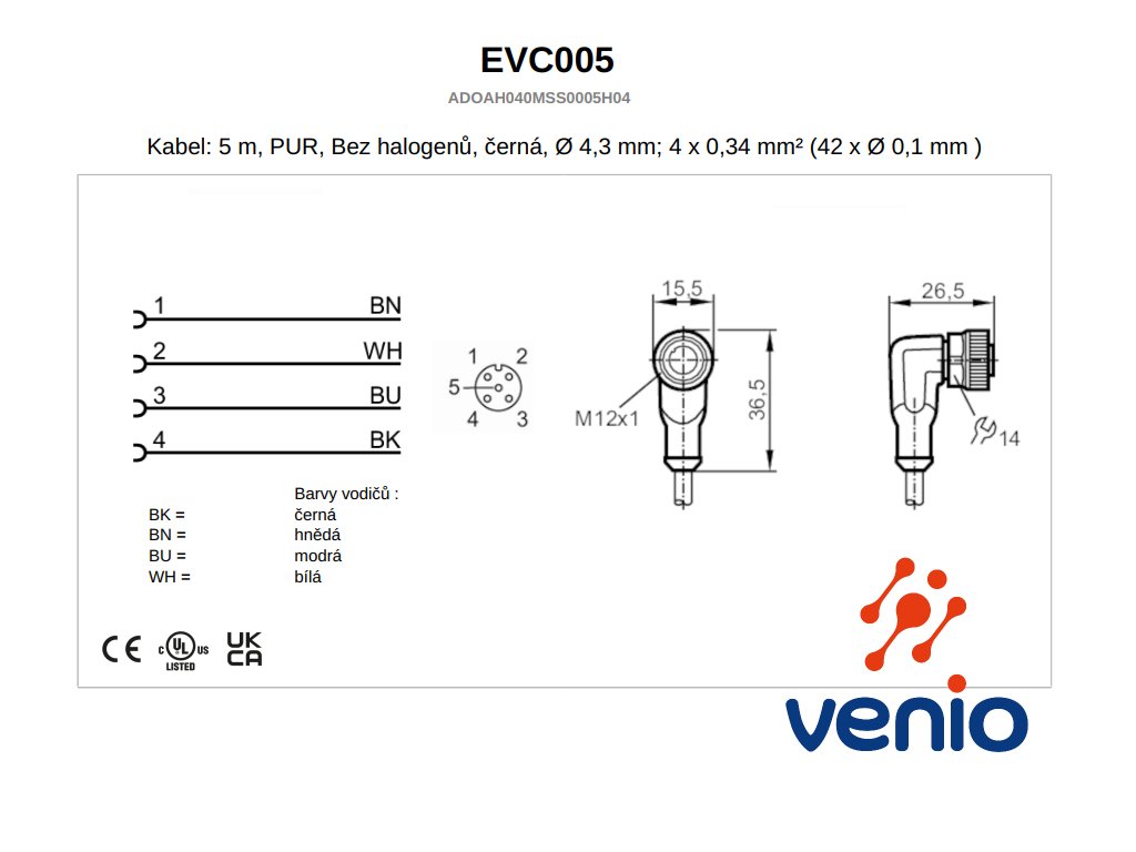EVC005 kábel 5m s uhlovym konektorom M12, 4-pin, samica, 4x0,34mm