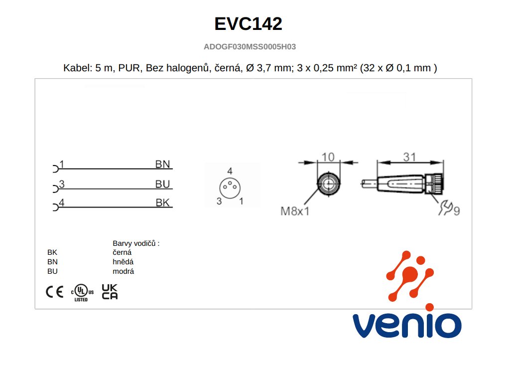 – Vodiče: 3×0,25 mm², farby vodičov: čierna, hnedá, modrá