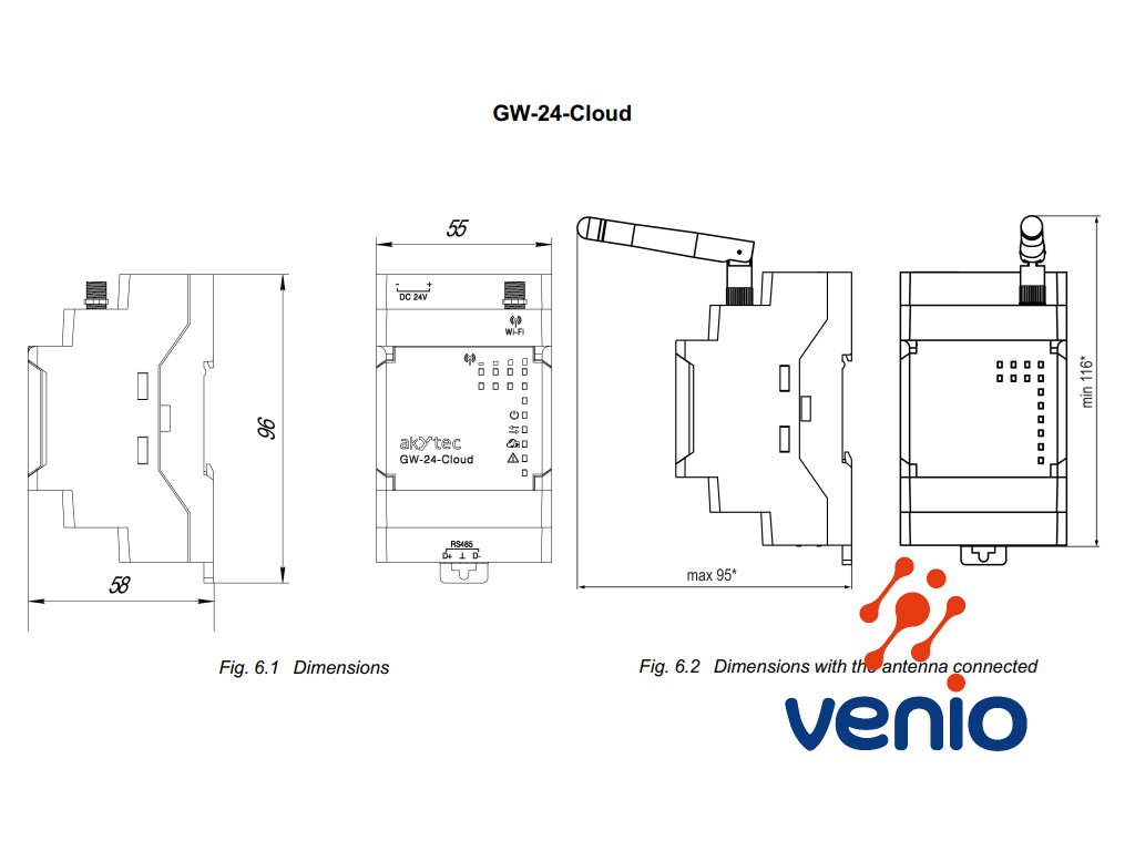 GW-24-Cloud je Wi-Fi sieťová brána určená na pripojenie zariadení s výstupom po linke RS485 s protokolom Modbus RTU, Modbus ASCII alebo akYtec, do služby akYtec Cloud prostredníctvom Wi-Fi siete (802.11 b/g/n). Brána sa pripája do existujúcej Wi-Fi infraštruktúry v objekte, napríklad do priemyselného alebo domového Wi-Fi routera, ktorý má prístup do internetu. GW-24-Cloud sám o sebe nevytvára internetové pripojenie; používa Wi-Fi sieť, ktorú mu poskytne externý router. Umožňuje online prenos dát, vzdialenú diagnostiku a správu pripojených zariadení v Akytec Cloud pre prístroje fyzicky umiestnené v priestoroch s dostupným Wi-Fi signálom.