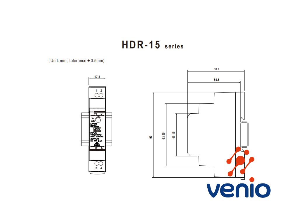 HDR-15-24 napájací zdroj 24VDC, 0,63A, 15W