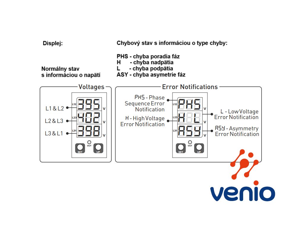 Chyba asymetrie (ASY): Keď rozdiel napätia medzi fázami prekročí nastavenú hodnotu asymetrie (nastaviteľné v rozsahu 5-50%), zariadenie čaká čas čakania na chybu, potom sa na obrazovke zobrazí "ASy", výstupné relé sa vypne a LED OUT zhasne. Ak sa rozdiel napätia medzi fázami zníži o 2% od nastavenej hodnoty asymetrie, zariadenie čaká na čas ukončenia chyby, potom sa zopne relé a rozsvieti sa LED OUT.