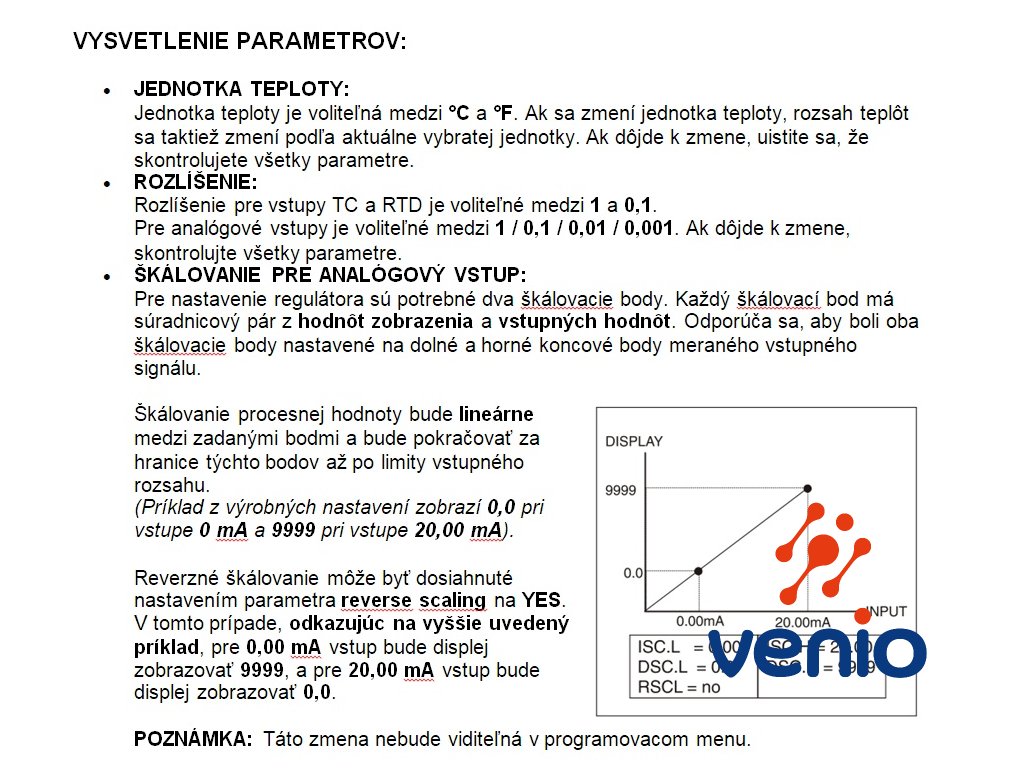Pre nastavenie regulátora sú potrebné dva škálovacie body. Každý škálovací bod má súradnicový pár z hodnôt zobrazenia a vstupných hodnôt. Odporúča sa, aby boli oba škálovacie body nastavené na dolné a horné koncové body meraného vstupného signálu. Škálovanie procesnej hodnoty bude lineárne medzi zadanými bodmi a bude pokračovať za hranice týchto bodov až po limity vstupného rozsahu. (Príklad z výrobných nastavení v o fotogalérii zobrazí 0,0 pri vstupe 0 mA a 9999 pri vstupe 20,00 mA). Reverzné škálovanie môže byť dosiahnuté nastavením parametra reverse scaling na YES. V tomto prípade, odkazujúc na vyššie uvedený príklad, pre 0,00 mA vstup bude displej zobrazovať 9999, a pre 20,00 mA vstup bude displej zobrazovať 0,0.
