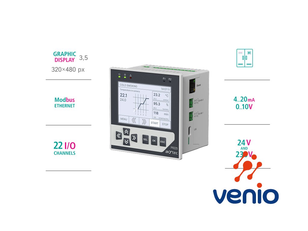 PR225 predstavuje novú generáciu programovateľných relé a HMI od akYtec – kompaktné zariadenie v panelovom prevedení s 3,5" farebným grafickým IPS displejom a Ethernetom. Spája funkcie logického riadenia, vizualizácie a komunikácie v jednom prístroji.