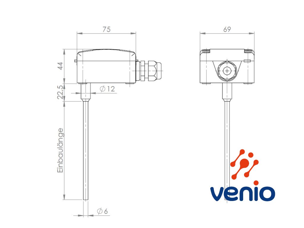 Snímač je vyrobený v praktickej plastovej krabičke určenej na priamu montáž na spiro kruhové alebo hranaté potrubie klimatizácie a vzduchotechniky pomocou plastovej príruby s umiestnením snímača do hĺbky 100mm do otvoru v potrubí. Stupeň krytia IP65 umožňuje používať snímač vo vnútorných a vonkajších priestoroch s vysokými nárokmi na ochranu proti prachu a vode. Najčastejšia je inštalácia pre meranie teploty vzduchu vo vzduchotechnických a klimatizačných rozvodoch a potrubiach, pre vonkajšie alebo vnútorné priestory, v priemysle, poľnohospodárstve alebo automatizácii budov a chladiacich skladov.