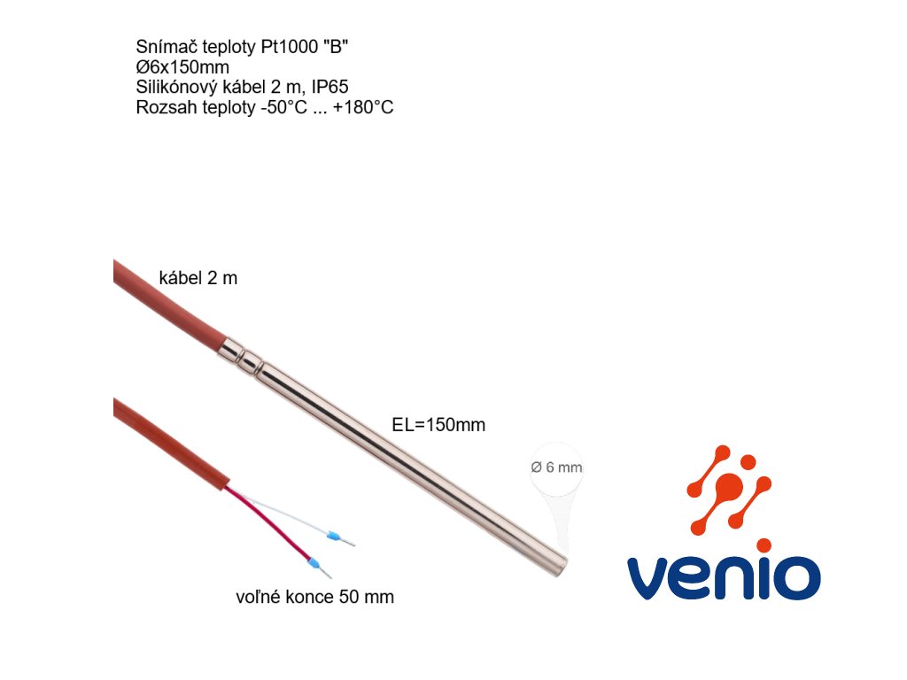 Snímač teploty Pt1000B Ø6x150mm do 180°C silikónový kábel 2 m IP65