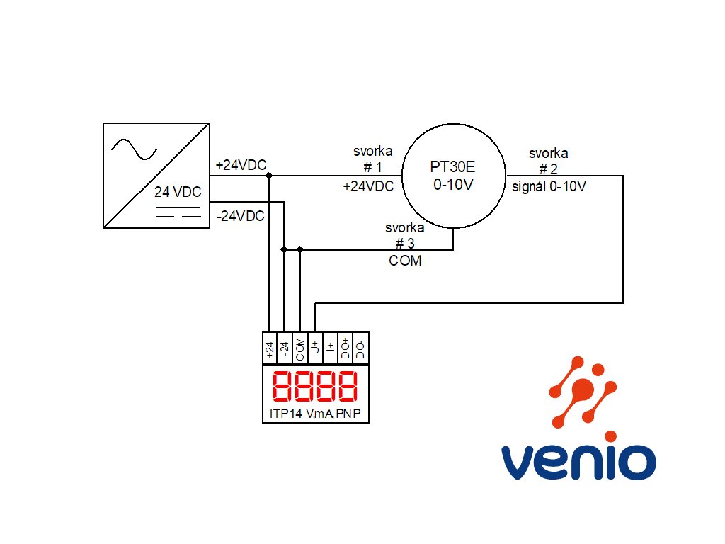 svorka 1: +24 VDC (12...36V), svorka 2: výstup 0-10V, svorka 3: COM (-24V)