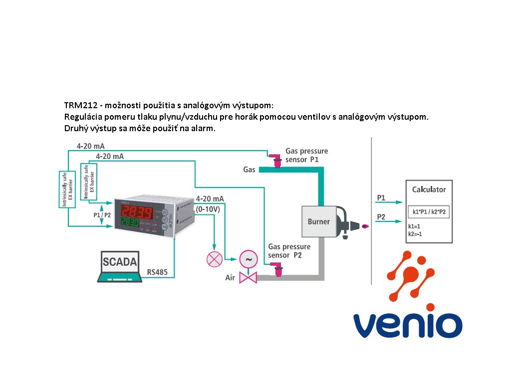 Regulácia pomeru plynu/vzduchu pomocou ventilov s analógovým vstupom. Druhý výstup sa môže použiť na alarm.