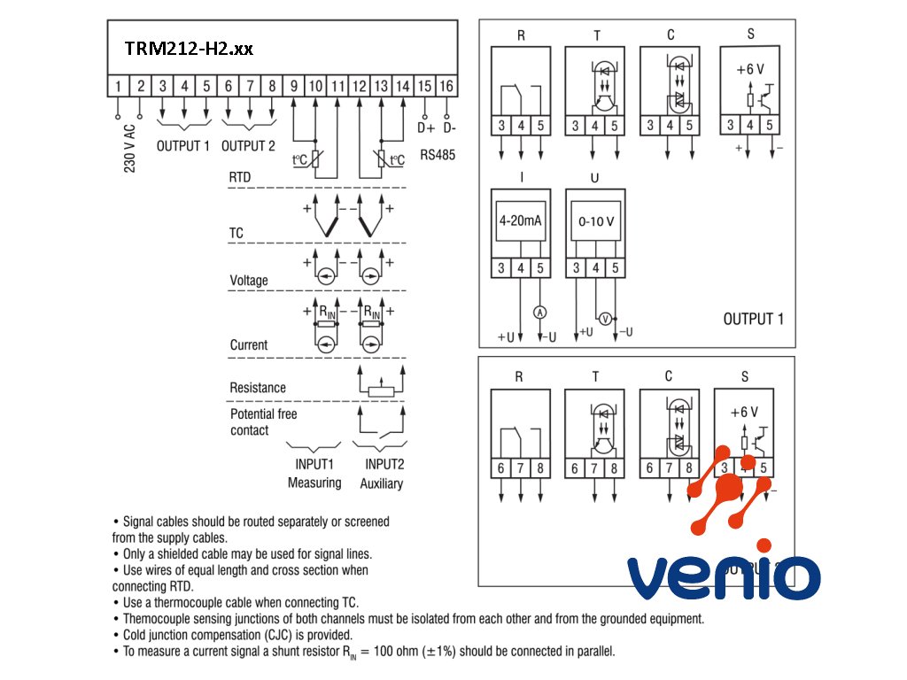 TRM212 využíva napájanie 230 VAC a môže byť prevádzkované ako Slave v sieti Modbus (RTU alebo ASCII) cez rozhranie RS485.